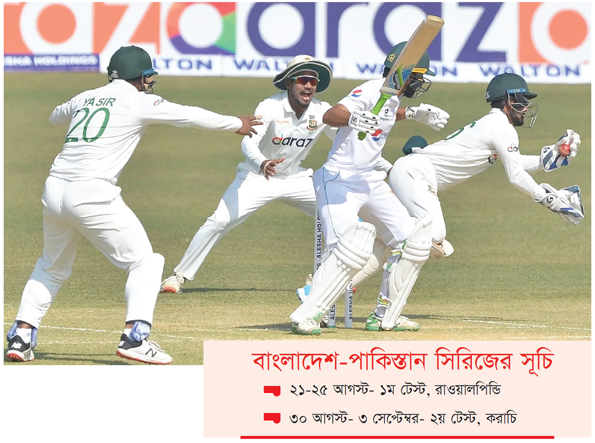 তিন ম্যাচের টি-টোয়েন্টি সিরিজ হারার পর একমাত্র টেস্টেও হেরেছিলেন টাইগাররা। টেস্ট ক্রিকেটে এখনো পাকিস্তানের বিপক্ষে কোনো জয় পায়নি বাংলাদেশ। ১৩ টেস্টে হেরেছে ১২ ম্যাচ, ড্র করতে পেরেছে একটি ম্যাচ। টাইগাররা টেস্ট ক্রিকেটে ব্যস্ত সূচি পার করবে চলতি বছরের বাকি সময়ে। পাকিস্তানের বিপক্ষে সিরিজের পর ভারতের মাটিতে আরও দুটি টেস্ট খেলবে তারা। সাদা পোশাকের লড়াইয়ের সঙ্গে ভারতীয়দের বিপক্ষে তিনটি টি-টোয়েন্টিও খেলার কথা রয়েছে সেপ্টেম্বর-অক্টোবরে। এরপর দেশে ফিরে দক্ষিণ আফ্রিকার সঙ্গে লাল বলের দুটি ম্যাচ খেলবে বাংলাদেশ। ডিসেম্বরে ওয়েস্ট ইন্ডিজে পূর্ণাঙ্গ সিরিজ খেলতে যাবেন শান্তরা। আগস্টে বাংলাদেশ-পাকিস্তান সিরিজটি ২০২৪ টি-টোয়েন্টি বিশ্বকাপের পর দুই দেশেরই প্রথম। বাংলাদেশের বিপক্ষে সিরিজ খেলার পর ঘরের মাঠে পাকিস্তান তিনটি টেস্ট খেলবে ইংল্যান্ডের বিপক্ষে। অক্টোবর মাস জুড়ে ইংলিশদের বিপক্ষে লড়াই শেষে ২০২৪-২৫ মৌসুমে ঘরের মাঠে সাদা পোশাকে তাদের পরবর্তী সিরিজ হবে জানুয়ারিতে।