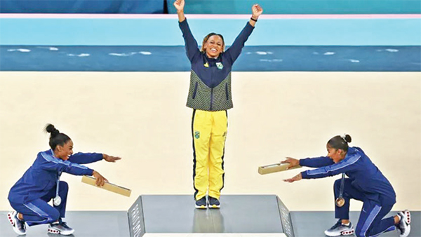 অলিম্পিকের জিমন্যাস্টিকসের পোডিয়ামে দেখা মিলল অভূতপূর্ব এক দৃশ্যের। প্যারিসের ক্রীড়াযজ্ঞ দিয়ে প্রথমবার এই গেমসের পদকজয়ী তিনজনই ‘ব্ল্যাক’। বর্ণবাদ নিয়ে বিশ্বজুড়ে যে অস্থির অবস্থা, সেটিরই মোক্ষম জবাব হয়ে এলো এবারের আসর। জিমন্যাস্টিকসের ফ্লোর ফাইনালের পোডিয়ামে ওঠা কালো বর্ণের তিনজনে আলোকিত হলো প্যারিস অলিম্পিক। প্যারিসে জিমন্যাস্টিকসে সব আলো নিজের দিকে টেনে নিয়েছেন সিমোন বাইলস। তবে ফ্লোর ফাইনালে সোনা জিততে পারেননি। এই ইভেন্টে সোনার হাসি ব্রাজিলের রেবেকা আন্দ্রাদের। আর ব্রোঞ্জ জিতেছেন জর্ডান চিলিস। পদকজয়ী এই তিনজনই কালো বর্ণের। জিমন্যাস্টিকসের অলিম্পিক ইতিহাসে যা প্রথমবার ঘটল। কালোর শক্তি দেখিয়ে বিশ্বকে নতুন এক বার্তাও দিয়েছেন তারা। পোডিয়ামে উঠে তিন বিজয়ী ভালোবাসা আর সম্মানে একে অন্যকে বেঁধে নিলেন। পোডিয়ামের ওপর সোনা জয়ী রেরেকাকে দুই পাশ থেকে বাইলস ও চিলিসের কুর্ণিশ করার দৃশ্য ইতিহাস হয়ে থাকবে। হার-জিত ভুলে গিয়ে কালোর জয় উদযাপন করেছেন তারা। রেরেকা যেমন বলেছেন, ‘আমরা কালোর শক্তি দেখিয়েছি। আমি নিজেকে ভালোবাসি, আমার গায়ের রঙকে ভালোবাসি। যদিও এটাকে (গায়ের রং) আমি গুরুত্ব দেই না। একই বিষয় জর্ডান (চিলিস) ও সিমোনের (বাইলস) ক্ষেত্রেও।’ সোনাজয়ী এই ব্রাজিলিয়ান জানিয়েছেন, মাঝেমধ্যে গায়ের রং জিমন্যাস্টিকসের জন্য ভীষণ কঠিন হয়ে ওঠে। তবে এই তিনজন প্রমাণ করেছেন ‘সব সম্ভব’ এবং ‘আপনি চাইলেই পারবেন’। প্রায় একই রকম কথা বলেছেন রুপা জয়ী বাইলস। আমেরিকান তারকার বক্তব্য, সে (রেবেকা) অসাধারণ। সে রানী। সবচেয়ে বড় বিষয় হলো, এই পোডিয়ামটা অল-ব্ল্যাক। এটা আমাদের আরো বেশি উত্তেজিত করেছে।’