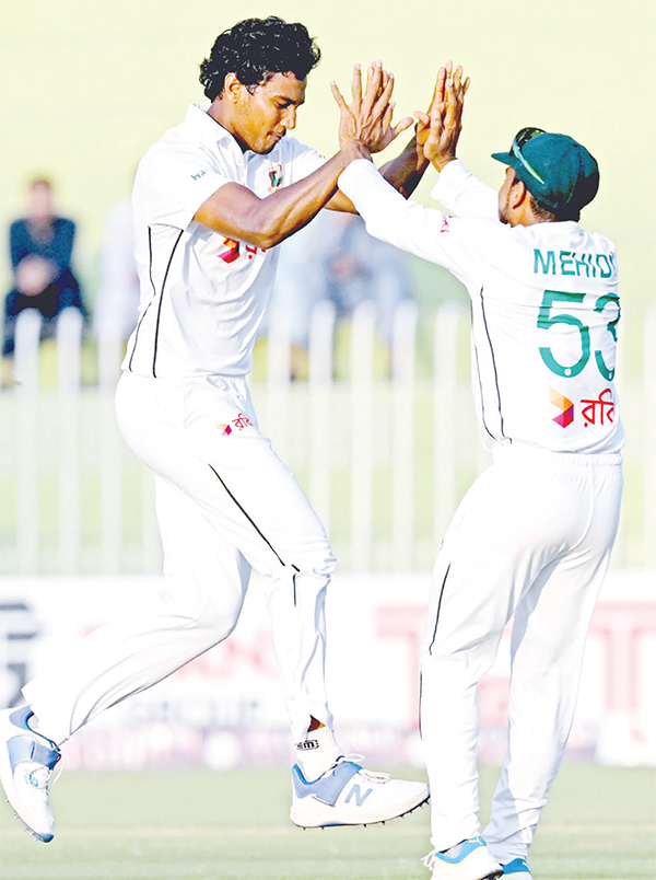 বাংলাদেশকে প্রথম ইনিংসে থামতে হয় ২৬২ রানে। ফলে ১২ রানের লিড পায় পাকিস্তান। প্রথম ইনিংসে বাংলাদেশের একমাত্র বোলার হিসেবে উইকেটশূন্য ছিলেন পেসার হাসান মাহমুদ। তবে ব্যাটিংয়ে একমাত্র অপরাজিত ব্যাটার ছিলেন তিনি। লিটন দাসকে দারুণ সঙ্গ দিয়ে পাকিস্তানের লিড কমাতে রেখেছেন কার্যকরী ভূমিকা। আর টাইগারদের শেষ বেলাও রাঙিয়ে দেন তিনি। পাকিস্তানের দুটি উইকেট তুলে নিয়েছেন এই পেসার। গতকাল রোববার রাওয়ালপিন্ডিতে সিরিজের দ্বিতীয় ও শেষ টেস্টের তৃতীয় দিন শেষে ২১ রানে এগিয়ে আছে পাকিস্তান। প্রথম ইনিংসে ১২ রানের লিড নিয়ে দ্বিতীয় ইনিংস শুরু করে ৯ রানেই দুটি উইকেট হারায় স্বাগতিকরা। এর আগে নিজেদের প্রথম ইনিংসে ২৬২ রানে গুটিয়ে যায় বাংলাদেশ।