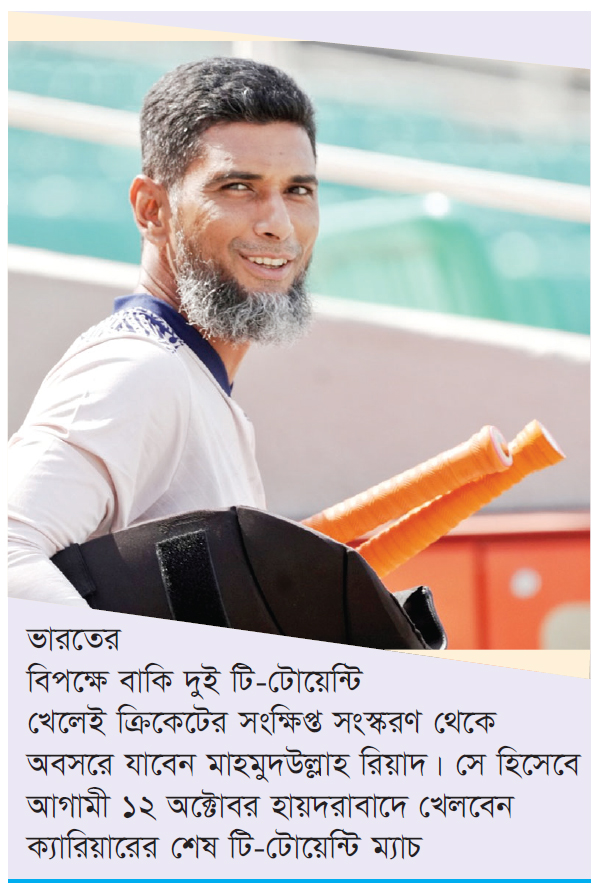সর্বশেষ টি-টোয়েন্টি বিশ্বকাপ থেকেই আলোচনায় ছিলেন টাইগার সাইলেন্টকিলার মাহমুদউল্লাহ রিয়াদ। টাইগার এই ব্যাটারের ব্যাটিংটা ঠিক টি-টোয়েন্টি সুলভ না বলে কম সমালোচনা হচ্ছিল না। যে কারণে ভারতের বিপক্ষে চলমান সিরিজের দলে তাকে দেখেও অনেকে অবাক হয়েছিলেন। এরই মধ্যে শোনা যাচ্ছে, ভারত সিরিজেই সংক্ষিপ্ত সংস্করণের ক্রিকেটে বিদায় বলে দেবেন অভিজ্ঞ এই ক্রিকেটার। ২০২১ সালের জুলাইয়ে জিম্বাবুয়ে সফরে আচমকা টেস্ট ক্রিকেট থেকে অবসর নিয়েছিলেন মাহমুদউল্লাহ রিয়াদ। এবার টি-টোয়েন্টি থেকেও বিদায় নেয়ার পথে এই ক্রিকেটার। ধারণা করা হচ্ছে, ভারতের বিপক্ষে বাকি দুই টি-টোয়েন্টি খেলেই ক্রিকেটের সংক্ষিপ্ত সংস্করণ থেকে অবসরে যাবেন রিয়াদ। সে হিসেবে আগামী ১২ অক্টোবর হায়দরাবাদে খেলবেন ক্যারিয়ারের শেষ টি-টোয়েন্টি ম্যাচ। তার আগে আজ বুধবার দিল্লিতে খেলবেন ভারতের বিপক্ষে দ্বিতীয় টি টায়েন্টিতেও।