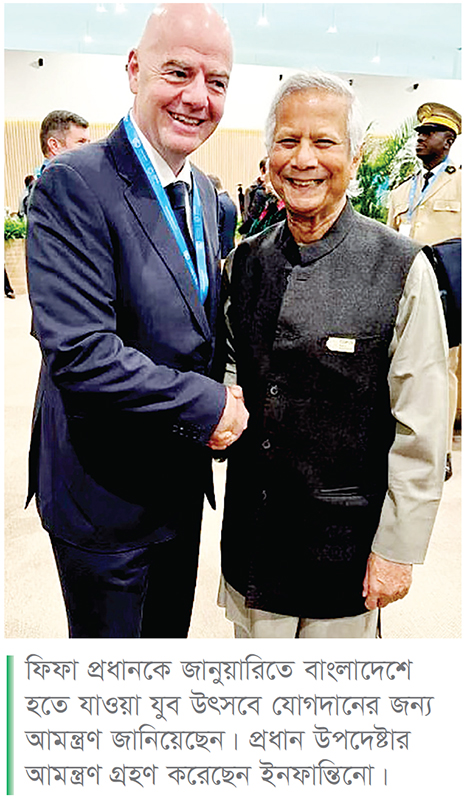 প্রধান উপদেষ্টার দপ্তরের ফেসবুক পেজে গতকাল মঙ্গলবার জানানো হয়, ‘ফিফা প্রেসিডেন্ট জিয়ান্নি ইনফান্তিনো জানুয়ারিতে বাংলাদেশে যুব উৎসবে যোগদানের জন্য প্রধান উপদেষ্টা অধ্যাপক মুহাম্মদ ইউনূসের আমন্ত্রণ গ্রহণ করেছেন। জলবায়ু সম্মেলনে যোগ দিতে প্রধান উপদেষ্টা আজারবাইজানে পৌঁছেছেন গত সোমবার। সফর শেষে ১৪ নভেম্বর তার দেশে ফেরার কথা রয়েছে।
