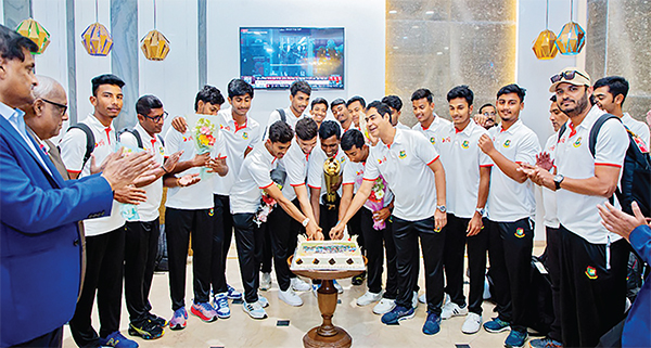 শুরুতে বাংলাদেশের যুবাদের ফুল দিয়ে বরণ করে নেন বিসিবির কর্তারা। পরবর্তীতে কেক কেটে শিরোপা উদযাপন করেন। এরপর সংবাদ সম্মেলনের মাধ্যমে এশিয়া জয়ের অপূর্ব গল্প শোনান বাংলাদেশের অধিনায়ক আজিজুল হাকিম তামিম। এশিয়ার শ্রেষ্ঠত্ব অর্জন করা তো চাট্টিখানি কথা নয়। বাংলাদেশের জন্যও এ যাত্রা ছিল কঠিন। সেমিফাইনালে পাকিস্তানের মুখোমুখি হতে হয়েছিল বাংলাদেশের যুবাদের। ফাইনালে কঠিন প্রতিপক্ষ ভারত। দুই দেয়াল টপকে যেতে কতটা কষ্ট করতে হয়েছে, তা ক্রিকেটাররা ছাড়া অন্য কেউ হয়তো বুঝবেন না। তামিম মনে করছেন আল্লাহ তাদেরকে কষ্টের পুরস্কার দিয়েছেন। তিনি বলেন, ‘আলহামদুলিল্লাহ, আমরা চ্যাম্পিয়ন হয়েছি। আমাদের এই সাফল্য দলগত পরিশ্রম আর আত্মবিশ্বাসের ফসল। আমরা শুরু থেকেই একে অপরের পাশে ছিলাম। অনূর্ধ্ব-১৫, ১৬, ১৭ স্তর থেকে এই দলটা গড়ে উঠেছে। সবার পরিশ্রমের ফলেই আজ আমরা চ্যাম্পিয়ন। আল্লাহ আমাদের সেই কষ্টের পুরস্কার দিয়েছেন।’