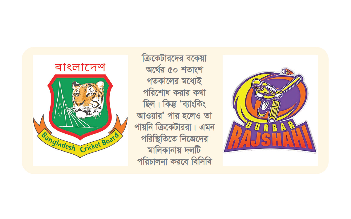 বাংলাদেশ প্রিমিয়ার লিগের (বিপিএল) প্রায় মাঝপথে এসেও একটি টাকাও পাননি দুর্বার রাজশাহীর খেলোয়াড়রা। যে কারণে আগের দিন অনুশীলন বয়কট করেন তারা। তবে ম্যানেজমেন্টের দেয়া প্রতিশ্রুতি অনুযায়ী ক্রিকেটারদের বকেয়া অর্থের ৫০ শতাংশ গতকাল বৃহস্পতিবারের মধ্যেই পরিশোধ করার কথা ছিল। কিন্তু ‘ব্যাংকিং আওয়ার’ পার হলেও তা পায়নি ক্রিকেটাররা। এমন পরিস্থিতিতে নিজেদের মালিকানায় দলটি পরিচালনা করবে বিসিবি সেই সিদ্ধান্তও হয়ে গেছে। বাংলাদেশ ক্রিকেট বোর্ডের (বিসিবি) একাধিক সূত্র এ খবর নিশ্চিত করেছে। দুর্বার রাজশাহীর ম্যানেজার মেহরাব হোসেন অপি আশ্বাস দিয়েছেন, বিকালেই খেলোয়াড়রা পেয়ে যাবেন পারিশ্রমিক।