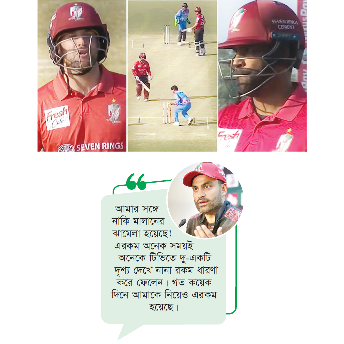 গত রোববার চট্টগ্রামের মাঠে চিটাগাং কিংসের বিপক্ষে ওপেনার ডেভিড মালানের সঙ্গে তার কিছু একটা হয়েছে দেখা গেল। তার সঙ্গে ভুল বোঝাবুঝিতে আউট হন তামিম। এর পর তামিম কিছু একটা বলেন। আবার সতীর্থ মালানকেও কিছু বলতে দেখা যায়। কী হয়েছিল বরিশালের এ দুই ক্রিকেটারের? এনিয়ে অনেকেই যখন কথা বলছেন তখন। তবে তামিম জানালেন বিস্তারিত। গতকাল সোমবার বিষয়টি নিয়ে ফেসবুক একটি পোস্ট দেন তিনি। তামিম ইকবাল লিখেছেন, অনেকেই আমাকে জিজ্ঞেস করছেন, মাঠে ডাভিড মালানের সঙ্গে কিছু হয়েছিল কিনা। এটা নিয়ে নাকি অনেক আলোচনা হচ্ছে। অথচ আমার সঙ্গে মালানের কিছুই হয়নি। মালান তো ওভাবে জবাব দিচ্ছিল প্রতিপক্ষের একজনকে! মাঠে দুই ব্যাটসম্যানের ভুল বোঝাবুঝি হতেই পারে। তাৎক্ষণিকভাবে হতাশা প্রকাশ করাও স্বাভাবিক। আমি রান আউট হওয়ার পরই মালান হাতের ইশারায় ‘সরি’ বলেছে। আমি সেদিকে তাকিয়ে মাঠের বাইরে চলে যাই। তার সঙ্গে কোনো কথাই হয়নি। কাছেই থাকা প্রতিপক্ষের একজন ফিল্ডার তখন মালানকে একটা কথা বলেছে, যা তার ভালো লাগেনি। মালান সে ফিল্ডারকেই জবাব দিচ্ছিল, তার দিকেই এগিয়ে যাচ্ছিল। অথচ সেটাকেই অনেকে বানিয়ে ফেলেছে, আমার সঙ্গে নাকি মালানের ঝামেলা হয়েছে! এরকম অনেক সময়ই অনেকে টিভিতে দু-একটি দৃশ্য দেখে নানা রকম ধারণা করে ফেলেন। গত কয়েক দিনে আমাকে নিয়েও এরকম হয়েছে। কিন্তু কোনো ঘটনা তো হুট করে হয় না। এটার পেছনেও অনেক ঘটনা থাকে। মাঠে এরকম অনেক কিছুই হয়, যা টিভিতে পুরোপুরি ফুটে ওঠে না এবং সেটা উচিতও নয়। কিন্তু টিভিতে দু-একটি দৃশ্য দেখেই চূড়ান্ত ধারণা নেয়া উচিত নয়। যাদের নিয়ে ঘটনা, যারা মাঠে থাকেন, তারা সবকিছু জানেন। আজকের উদাহরণ দিয়েই আবার বলছি, টিভিতে এক-দুই ঝলক দেখেই সিদ্ধান্তে পৌঁছে যাওয়া উচিত নয়।