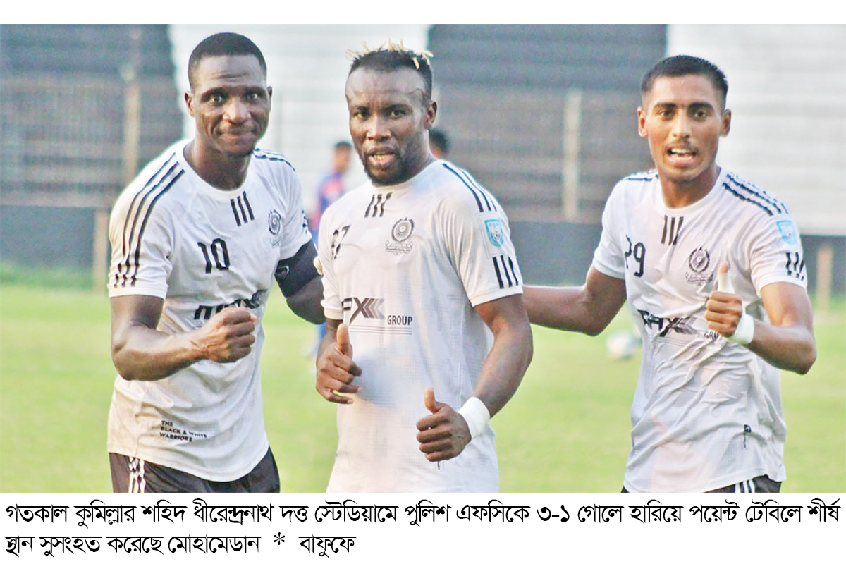 আস্তে আস্তে বাংলাদেশ প্রিমিয়ার লিগের শিরোপার দিকে এগিয়ে চলেছে ঐতিহ্যবাহী মোহামেডান স্পোর্টিং ক্লাব। গতকাল শুক্রবার কুমিল্লার শহিদ ধীরেন্দ্রনাথ দত্ত স্টেডিয়ামে পুলিশ এফসিকে ৩-১ গোলে হারিয়েছে ব্ল্যাক অ্যান্ড হোয়াইট খ্যাত দলটি। এই জয়ে ১৩ ম্যাচে ১১ জয় ও এক ড্রয়ে ৩৪ পয়েন্ট নিয়ে শীর্ষে আলফাজ আহমেদের দল। দ্বিতীয় স্থানে থাকা আবাহনীর চেয়ে আপাতত ৭ পয়েন্ট নিয়ে এগিয়ে তারা। ম্যাচে জোড়া গোল করেন মোহামেডানের নাইজেরিয়ান ফরোয়ার্ড ইমানুয়েল সানডে।