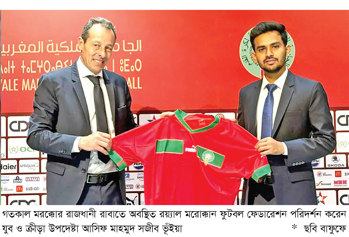 বাংলাদেশের ফুটবলের উন্নয়নে রয়্যাল মরক্কো ফুটবল ফেডারেশন সহযোগিতার হাত বাড়িয়ে দেওয়ার আশ্বাস ব্যক্ত করেছে। বাংলাদেশের সঙ্গে তাদেরকে একটি প্রীতি ম্যাচ খেলার প্রস্তাবও দেওয়া হয়েছে। গতকাল বুধবার মরক্কোর রাজধানী রাবাতে অবস্থিত রয়্যাল মরোক্কান ফুটবল ফেডারেশন পরিদর্শন করেন যুব ও ক্রীড়া উপদেষ্টা আসিফ মাহমুদ সজীব ভূঁইয়া। এ সময় ফেডারেশনের সেক্রেটারি জেনারেল তারিক নাজেম এবং ডিরেক্টর হাসান খারবোশ তাকে স্বাগত জানান। তাকে ফেডারেশনের কার্যক্রম সম্পর্কে অবহিত করেন তারা।