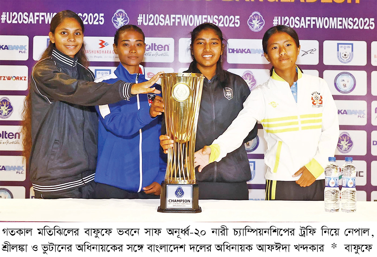 আজ থেকে শুরু হচ্ছে সাফ অনূর্ধ্ব-২০ নারী ফুটবলের এই আসর। চলবে ২১ জুলাই পর্যন্ত। বাংলাদেশ ছাড়া এই আসরে খেলবে নেপাল, ভুটান ও শ্রীলঙ্কা। ডাবল রাউন্ড লিগ পদ্ধতিতে হবে এই আসর। যেখানে সর্বোচ্চ পয়েন্ট পাওয়া দলকে বিজয়ী ঘোষণা করা হবে। কিংস অ্যারেনাতে চারজাতির টুর্নামেন্টে বাংলাদেশ ছাড়াও অংশ নিচ্ছে- নেপাল, ভুটান ও শ্রীলঙ্কা। সবাই সবার সঙ্গে দুটি করে ম্যাচ খেলবে। ছয় ম্যাচ শেষে যারা পয়েন্টের শীর্ষে থাকবে তারাই পাবে ট্রফি। সাফের সিনিয়র আসরে টানা দু’বার শিরোপা জিতেছে বাংলাদেশ। বয়সভিত্তিক আসরেও ট্রফি কম নয়। তার ওপর এবার প্রথমবারের মতো এশিয়ান কাপের মূল পর্বে জায়গা করে নিয়েছে। এমন অর্জনের পর দক্ষিণ এশিয়ায় বাংলাদেশকে অন্য চোখে দেখছে সবাই। শুরু হতে যাওয়া সাফ অনূর্ধ্ব-২০ নারী ফুটবল টুর্নামেন্টের সংবাদ সম্মেলনে অংশগ্রহণকারী তিন দেশের সবার কণ্ঠেই ছিল স্বাগতিকদের নিয়ে সমীহ।