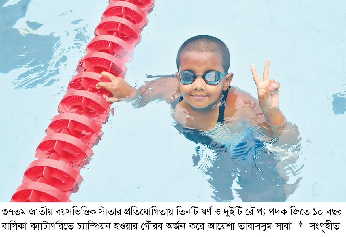 বয়স মাত্র ৯। এই বয়সেই জাতীয় পর্যায়ের সাঁতার প্রতিযোগিতায় স্বর্ণ পদক জিতে নজর কেড়েছে রাজশাহীর ক্ষুদে সাঁতারু আয়েশা তাবাসসুম সাবা। এবারের ৩৭তম জাতীয় বয়সভিত্তিক সাঁতার প্রতিযোগিতায় তিনটি স্বর্ণ ও দুইটি রৌপ্য পদক জয় করে ১০ বছর বালিকা ক্যাটাগরিতে চ্যাম্পিয়ন হওয়ার গৌরব অর্জন করে সাবা। ভবিষ্যতে তার লক্ষ্য আন্তর্জাতিক পর্যায়ে দেশকে প্রতিনিধিত্ব করা। অলিম্পিকে স্বর্ণ জয়েরও স্বপ্ন দেখে সাবা। আর এ জন্য সবার সহযোগিতা কামনা করেছে এই ক্ষুদে সাঁতারু। রাজশাহী মহানগরীর চন্দ্রিমা থানাধীন ভদ্রা আবাসিক এলাকার দস্তগির আব্দুল্লাহ ও মারুফা খাতুনের বড় মেয়ে সাবা।