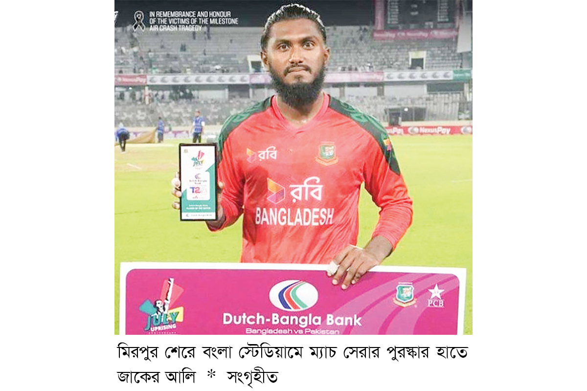 রাজধানীর উত্তরায় মাইলস্টোন স্কুল ও কলেজে বিমান বিধ্বস্তে হতাহতের ঘটনায় রাষ্ট্রীয় শোক ছিল গত মঙ্গলবার। এ শোকের মাঝে বাংলাদেশি ক্রিকেটাররা সিরিজের দ্বিতীয় টি-টোয়েন্টি খেলেছেন পাকিস্তানের বিপক্ষে। ম্যাচ জিতে ইতিহাস গড়েছে স্বাগতিকরা। ৪৮ বলে ৫৫ করে ম্যাচ সেরার পুরস্কার জেতা জাকের আলি জানালেন বুকে চাপা কষ্ট নিয়ে ম্যাচটা খেলতে নেমেছিলেন সবাই। তিনি বললেন, ‘জিনিসটা কঠিন ছিল। আসলে এরকম মর্মান্তিক দুর্ঘটনা কারোই কাম্য নয়। সবার জন্যই দোয়া। ওই সময়েই দোয়া করেছি। যারা নিহত হয়েছেন, তাদের আত্মার মাগফেরাত কামনা করছি।’ শোককে শক্তিতে পরিণত করে নিজেদের সেরাটা খেলার কথাও বললেন জাকের, ‘আসলে দল হিসেবে কঠিন ছিল। সবারই মন খারাপ ছিল। কিন্তু যেটা আপনি বললেন, আমরা পেশাদার, তাই মাঠে নামতে হবে। তাই সব কিছু ভুলে মাঠে নেমে আমাদের সেরাটা দেওয়ার চেষ্টা করেছি।’