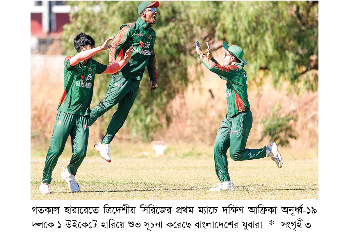 লক্ষ্য ছিল মাত্র ১২৯ রান। বাংলাদেশের নবম ব্যাটসম্যান হিসেবে ইকবাল হোসেন যখন সাজঘরে ফিরলেন তখনও ২০ রানে পিছিয়ে। হাতে কেবল ১ উইকেট। দক্ষিণ আফ্রিকা, জিম্বাবুয়ে ও বাংলাদেশ অনূর্ধ্ব-১৯ দল নিয়ে হারারেতে চলছে ত্রিদেশীয় সিরিজ। গতকাল দ্বিতীয় ম্যাচে মুখোমুখি বাংলাদেশ ও দক্ষিণ আফ্রিকা যুবারা। ভালো বোলিংয়ে দক্ষিণ আফ্রিকাকে ১২৮ রানে আটকে রাখলেও চরম ব্যাটিং বিপর্যয়ে পড়ে বাংলাদেশ। শেষ উইকেটে জয়ের জন্য প্রয়োজন ছিল ২০ রান। ভরসা করার মতো ছিলেন কেবল সাইমুন বশির। ব্যাটসম্যানদের আসা-যাওয়ার মিছিলে সাইয়ুন লড়ে যাচ্ছিলেন। শেষ পর্যন্ত তার ব্যাটেই নাটকীয় জয় পায় বাংলাদেশ। সঙ্গী হারানোর পর ২৮তম ওভারে জেমসকে পরপর দুই বলে দুই চার হাঁকান তিনি। পরের ওভারে বয়েসকে একটি চারের পর বিশাল ছক্কা উড়ান। তাতেই সমীকরণ নেমে আসে ১ রানে। ২৮তম ওভারের চতুর্থ বলে ১ রান নিয়ে দলের ১ উইকেটের জয় নিশ্চিত করেন এই ব্যাটসম্যান। ৩৯ বলে ৭ চার ও ১ ছক্কায় ৪৫ রানে অপরাজিত থাকেন সাইমুন। অপরপ্রান্তের ব্যাটসম্যান স্বাধীনকে স্ট্রাইক নেওয়ার সুযোগই দেননি তিনি। তার বিচক্ষণ ব্যাটিংয়েই বাংলাদেশ শেষের হাসিটা হাসতে পারে। বাকিদের ব্যাটিং একদমই ভালো হয়নি। ওপেনার জাওয়াদ আবরার করেন ২০ রান। আধিনায়ক আজিজুল হাকিমের ব্যাট থেকে আসে ৫ রান। আব্দুল্লাহ করেন ১৪ রান। দক্ষিণ আফ্রিকার বোলারদের হয়ে ৩৩ রানে ৪ উইকেট নেন বেসন। ৩ উইকেট পেয়েছেন মাজোলা। এর আগে বাংলাদেশের বোলারদের তোপে আগে ব্যাটিংয়ে নেমে দক্ষিণ আফ্রিকা বেশিদূর যেতে পারেনি। ৩৪.৪ ওভারে ১২৮ রানে থেমে যায় তাদের ইনিংস। পেসার ইকবাল হোসেন ইমন ৩২ রানে ৪ উইকেট নিয়ে ছিলেন দলের সেরা। ২টি করে উইকেট পেয়েছেন সাইমুন ও স্বাধীন। প্রোটিয়াদের কেউ ত্রিশের ঘরে যেতে পারেননি। সর্বোচ্চ ২৮ রান করেন আরমান মানাক। আগের দিন ডাবল সেঞ্চুরি করা স্কালভিক আজ করেছেন ১০ রান। অলরাউন্ড পারফরম্যান্সে ম্যাচ সেরা হয়েছেন সাইমুন। আগামী ২৮ জুলাই একই মাঠে মুখোমুখি হবে জিম্বাবুয়ে ও বাংলাদেশ।