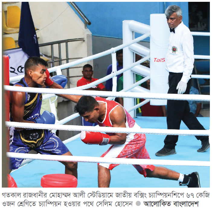 দুই বছর আগে হাংজু এশিয়ান গেমসে দুর্দান্ত খেলেছিলেন বক্সার সেলিম হোসেন। অল্পের জন্য পদক হাতছাড়া হয়েছিল তার। এ নিয়ে তৎকালীন সাধারণ সম্পাদক মাজহারুল ইসলাম আফসোসে পুড়েছিলেন। পদক হাতছাড়া হওয়ায় হতাশ হয়েছিলেন বিওএর কর্তারাও। সেই সেলিম জাতীয় চ্যাম্পিয়নশিপে অবশ্য হতাশ করেননি। দু’বছর পর হওয়া জাতীয় চ্যাম্পিয়নশিপে গতকাল বুধবার স্বর্ণপদক জিতেছেন তিনি। মোহাম্মদ আলী স্টেডিয়ামে সেনাবাহিনীর হয়ে ৬৭ কেজি ওজন শ্রেণিতে সেলিম খুলনা জেলার ইমন মেহেদী হাসানকে পরাস্ত করেছেন। দ্বিতীয় রাউন্ডের শুরুর দিকে সেলিমের কাছে ধরাশায়ী হন ইমন। টানা তিনটি জাতীয় আসরে সেরা হয়ে ৩৩ বছর বয়সি সেলিম সোনা জিতে উচ্ছসিত। তার কথা, ‘এর জন্য অনেক কষ্ট করেছি। কঠোর পরিশ্রম, ঘাম, কষ্ট আর বিশ্বাস-সব কিছুর ফসল আজকের এই স্বর্ণপদক। এই অর্জন শুধু আমার না, এটা আমার কোচ, পরিবার, সতীর্থ আর সব সমর্থকদের।’ এখন এসএ গেমসের জন্য প্রস্তুতি নেবেন সেলিম।