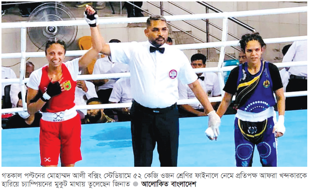 লাল সবুজ জার্সিতে বাংলাদেশের হয়ে আগেই আন্তর্জাতিক অভিষেক হয়েছিল জিনাত ফেরদৌসের। অপেক্ষা ছিল ঘরোয়া টুর্নামেন্টের। যুক্তরাষ্ট্রপ্রবাসী এই বক্সার দিন দুই আগে প্রথমবারের মতো পা রাখেন জাতীয় বক্সিং রিংয়ে। জাতীয় বক্সিং চ্যাম্পিয়নশিপে অভিষেকেই বাজিমাত করলেন তিনি। গতকাল বৃহস্পতিবার পল্টনের মোহাম্মদ আলী বক্সিং স্টেডিয়ামে ৫২ কেজি ওজন শ্রেণির ফাইনালে নেমে প্রতিপক্ষ আফরা খন্দকারকে হারিয়ে চ্যাম্পিয়নের মুকুট মাথায় তুলেছেন জিনাত। তিন রাউন্ডের সবকটিতেই আনসারের আফরাকে হারিয়ে স্বর্ণপদক জিতে নেন নরসিংদী গুডউইল বক্সিং ক্লাবের এই বক্সার।
