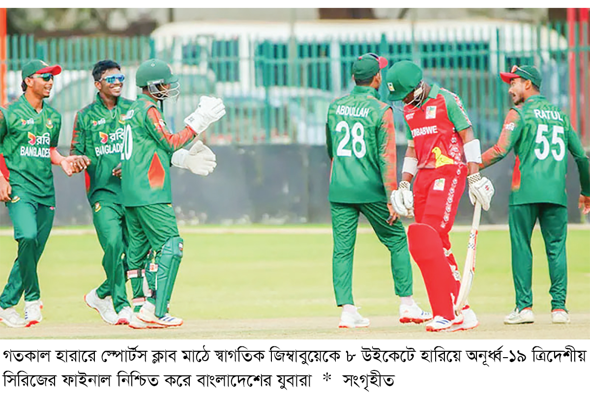 টানা জয়ে অনূর্ধ্ব-১৯ ত্রিদেশীয় ওয়ানডে সিরিজে রীতিমত উড়ছিল বাংলাদেশের যুবারা। তবে গত বৃহস্পতিবার লাল সবুজের যুবাদের মাটিতে নামিয়ে আনে দক্ষিণ আফ্রিকা। প্রোটিয়া যুবাদের বিপক্ষে লড়াই করেও জিততে পারেনি টাইগার জুনিয়রা। একদিন পর ফের জ্বলে উঠল আজিজুল হাকিম তামিমের দল। জিম্বাবুয়েকে ধরাশয়ী করেছে তারা। গতকাল শুক্রবার হারারে স্পোর্টস ক্লাব মাঠে স্বাগতিকদের ৮৯ রানে অলআউট করে ৮ উইকেটে জিতেছে বাংলাদেশ। এই জয়ে ফাইনাল নিশ্চিত হয় বাংলাদেশের। টাইগার যুবাদের জয়ে ফাইনাল নিশ্চিত হয়েছে দক্ষিণ আফ্রিকারও। চার ম্যাচে দুই দলের পয়েন্ট ছয়। রান রেটে আপাতত শীর্ষে বাংলাদেশ। স্বাগতিক জিম্বাবুয়ে জিততে পারেনি একটিও। ফাইনালের দুই দল চূড়ান্ত হলেও টুর্নামেন্টের প্রাথমিক পর্বে আরও এক রাউন্ডে দুটি করে ম্যাচ বাকি আছে সব দলেরই। আগের দিন পরাজয়ের ধাক্কা সামলে গতকাল শুক্রবার বাংলাদেশ জয়ের পথ তৈরি করে ফেলে ম্যাচের প্রথম ভাগেই। এদিন ইকবাল হোসেন ইমনের তোপে ২২.৩ ওভারে জিম্বাবুয়ে গুটিয়ে যায় স্রেফ ৮৯ রানে। মূল স্ট্রাইক বোলারদের একজন আল ফাহাদ এ দিন বিশ্রামে থাকলেও আরেকজন ইকবাল হোসেন ইমন চার উইকেট নিয়ে ভিত গড়ে দেন দলের জয়ের। ভালো বোলিং করেন অন্যরাও। রান তাড়ায় বাংলাদেশ জিতে যায় স্রেফ ১৫.১ ওভারেই।