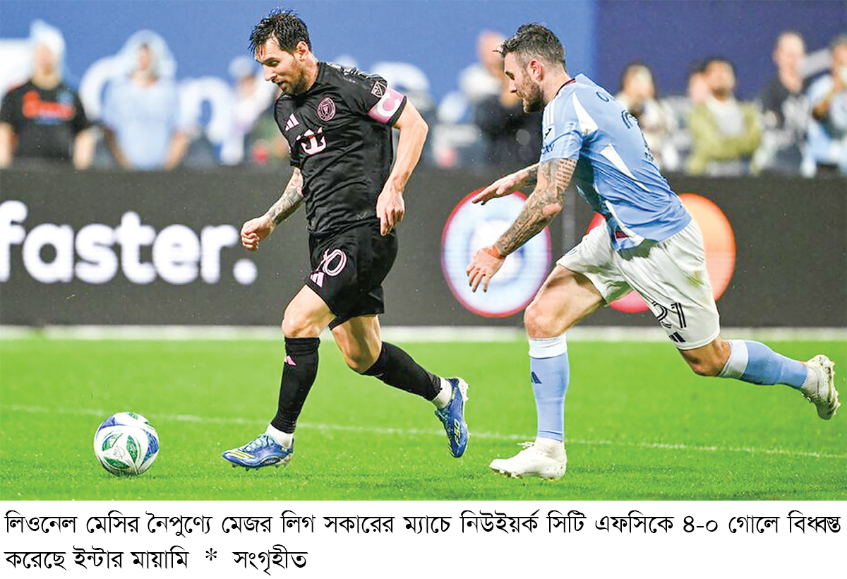 দেখার মতো দুটি গোল উপহার দিলেন লিওনেল মেসি। বানিয়ে দিলেন আরও একটি গোল। পেনাল্টি পেয়েও নিজে না নিয়ে এগিয়ে দিলেন সতীর্থকে। নইলে হতে পারতো তার হ্যাটট্রিক। ভাবছেন এসব আলোচনা এখন আবার কেন? কারণ, আগের ম্যাচের মতো ঠিক এই সবকিছুই যে আবার করেছেন তিনি! মেসিকে নিয়ে নতুন করে বলার আছে সামান্যই। শুধু বলা যায়, ছুটছেন তিনি অনিবারিত গতিতে। তার সেই ছুটে চলার সঙ্গী দল। মেজর লিগ সকারের ম্যাচে নিউইয়র্ক সিটি এফসিকে ৪-০ গোলে বিধ্বস্ত করেছে ইন্টার মায়ামি। আগের ম্যাচে জিতেই প্লে-অফের দুয়ারে ছিল মায়ামি। এই জয়ে তা নিশ্চিত হয়েই গেছে। নিউইয়র্ক সিটির মাঠে প্রথমার্ধের শেষ দিকে মায়ামিকে এগিয়ে দেন তরুণ আর্জেন্টাইন মিডফিল্ডার বালতাসার রদ্রিগেস। সেই গোলই মায়ামিকে এগিয়ে রাখে আরও ৩০ মিনিট। পরে ১২ মিনিটের মধ্যে দুর্দান্ত দুটি গোল করেন মেসি। লিগের গোলের তালিকায় শীর্ষে উঠেছিলেন তিনি আগেই। সেই অবস্থান আরও সংহত করলেন আর্জেন্টাইন জাদুকর। ২৩ ম্যাচেই তার গোল এখন ২৪টি। মায়ামির সর্বশেষ ১২ ম্যাচের আটটিতেই দুই বা এর বেশি গোল করলেন মেসি। মেজর লিগ সকারে এক মৌসুমে আট ম্যাচে একাধিক গোল করা মাত্র চতুর্থ ফুটবলার তিনি। অধিনায়কের দুই গোলের মাঝে পেনাল্টি থেকে গোল করেন লুইস সুয়ারেস। এই ম্যাচ দিয়েই নিষেধাজ্ঞা কাটিয়ে ফিরলেন উরুগুয়ের অভিজ্ঞ ফরোয়ার্ড। টানা তিন ম্যাচ জয়ের পর এবার হেরে গেল নিউইয়র্ক সিটি। গোল করতে ব্যর্থ হলো তারা ১০ ম্যাচে প্রথমবার। গতকাল বৃহস্পতিবার সকালে নিজেদের মাঠে প্রথম ৩০ মিনিটে দাপট ছিল নিউইয়র্ক সিটিরই। এই সময়ে অন্তত চার গোলের সুযোগ পেয়েও তারা কাজে লাগাতে পারেনি একটিও। এরপর আস্তে আস্তে ম্যাচে ফেরে মায়ামি। ৩৮তম মিনিটে মেসির বাঁকানো ফ্রি-কিক অল্পের জন্য বাইরে দিয়ে চলে যায়। ৪৩তম মিনিটে সের্হিও বুসকেতসের চমৎকার পাস থেকে বল পেয়ে দ্রুত গতিতে ছুটে আগুয়ান গোলকিপারের পাশ দিয়ে গোল করেন রদ্রিগেস।