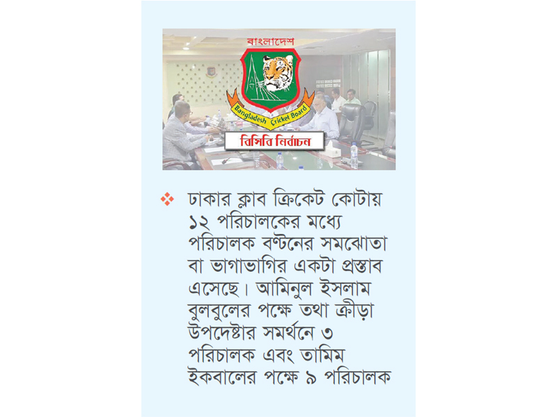 সমঝোতা, টানাপোড়েন। ক্রীড়া উপদেষ্টা আসিফ মাহমুদ সজীব ভূঁইয়ার আশীর্বাদপুষ্ট আমিনুল ইসলাম বুলবুল এবং তামিম ইকবালের নেতৃত্বাধীন বিএনপিপন্থি প্যানেলের মধ্যে ঢাকার ক্লাব কোটার ১২ পরিচালক নিয়ে যে সমঝোতার কথা শোনা যাচ্ছিল, তা কি শেষ পর্যন্ত ভেস্তে যাচ্ছে? গতকাল মঙ্গলবার সকালে অতিনাটকীয় ঘটনা না ঘটলে শেষ পর্যন্ত হয়তো সমঝোতার উদ্যোগ ভেস্তে যেতে পারে। আগেই জানা, ঢাকার ক্লাব ক্রিকেট কোটায় ১২ পরিচালকের মধ্যে পরিচালক বণ্টনের সমঝোতা বা ভাগাভাগির একটা প্রস্তাব এসেছে। আমিনুল ইসলাম বুলবুলের পক্ষে তথা ক্রীড়া উপদেষ্টার সমর্থনে ৩ পরিচালক এবং তামিম ইকবালের পক্ষে ৯ পরিচালক। এই ৯ঃ৩ অনুপাতেই আলোচনা চলছিল। কিন্তু সে আলোচনাটা প্রায় ভেস্তে যাওয়ার পথে। কারণ তামিম ইকবালপন্থি বিএনপি প্যানেল থেকে গত সোমবার গভীর রাতে ক্রীড়া উপদেষ্টার কাছে প্রস্তাব পাঠানো হয়েছে, তারা আমিনুল ইসলাম বুলবুলকে সভাপতি মেনেই ঢাকার ক্লাব কোটায় ১২ পরিচালক চান। অর্থাৎ ৯ঃ৩ বা ১০ঃ২ কিংবা ১১ঃ ১ নয়, তামিমপন্থিরাই ১২ পরিচালক পদে নির্বাচন করতে আগ্রহ প্রকাশ করেন।