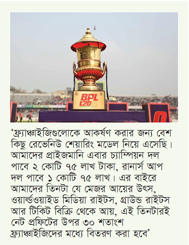 ক্রিকেট বিশ্বের সব প্রতিষ্ঠিত ফ্র্যাঞ্চাইজি লিগেই দলগুলি টুর্নামেন্টের রাজস্বের ভাগ পায় এবং তাদের আয়ের একটি আর্থিক কাঠামো থাকে। বিপিএলে সেটা কখনোই ছিল না। বছরের পর বছর ধরে দাবি উঠলেও বিসিবি বরাবরই তা উপেক্ষা করেছে। অবশেষে এবার থেকে তা হচ্ছে। এছাড়াও প্রাইজমানি বাড়ানোসহ ফ্র্যাঞ্চাইজিগুলোর জন্য আরও কিছু আকর্ষণীয় উদ্যোগ নেওয়া হচ্ছে এবার। ‘ফ্র্যাঞ্চাইজিগুলোকে আকর্ষণ করার জন্য বেশ কিছু রেভেনিউ শেয়ারিং মডেল নিয়ে এসেছি। আমাদের প্রাইজমানি এবার চ্যাম্পিয়ন দল পাবে ২ কোটি ৭৫ লাখ টাকা, রানার্স আপ দল পাবে ১ কোটি ৭৫ লাখ। এর বাইরে আমাদের তিনটা যে মেজর আয়ের উৎস, ওয়ার্ল্ডওয়াইড মিডিয়া রাইটস, গ্রাউন্ড রাইটস আর টিকেট বিক্রি থেকে আয়, এই তিনটারই নেট প্রফিটের উপর ৩০ শতাংশ ফ্র্যাঞ্চাইজিদের মধ্যে বিতরণ করা হবে।’ এছাড়াও আমাদের যে গ্রাউন্ড প্যারিমিটার বোর্ড থাকবে, যখন যে দলের খেলা হবে, ওই বোর্ডে তখন ম্যাচের ৩০ মিনিট সময় একেটি দলের জন্য বরাদ্দ থাকবে। দলগুলো ওই সময়ের মধ্যে তাদের স্পনসরদের বিজ্ঞাপন দেওয়ার জন্য ব্যবহার করতে পারবে বিনামূল্যে।