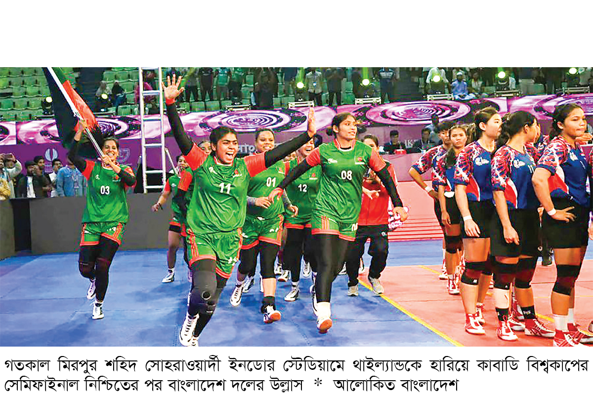 ম্যাচের শুরুতে উজ্জ্বল ছিল থাইল্যান্ড, বাংলাদেশ ছিল কিছুটা মন্থর। সময়ের সঙ্গে পাল্লা দিয়ে গুছিয়ে উঠল স্বাগতিকরা। লিড নিয়েই প্রথমার্ধ শেষ করা বাংলাদেশ উত্তেজনাপূর্ণ লড়াইয়ে থাইল্যান্ডকে ৪০-৩১ পয়েন্ট হারিয়ে নিশ্চিত করল নারী কাবাডি বিশ্বকাপের সেমিফাইনালের টিকিট, নিশ্চিত হল নারী বিশ্বকাপের ইতিহাসে দেশের প্রথম পদকও। ঢাকায় চলমান আসরের শুরু থেকেই পদকের প্রত্যাশার কথা জানিয়ে আসছিলেন বাংলাদেশের খেলোয়াড় ও কর্মকর্তারা। তীব্র প্রতিদ্বন্দ্বিতার পর থাইল্যান্ডের বিরুদ্ধে জয়ের মাধ্যমে সেমিফাইনাল এবং পদক নিশ্চিত করার পর লাল-সবুজ শিবিরে ছিল উচ্ছ্বাস। দলের খেলোয়াড় ও কোচিং স্টাফরা শহিদ সোহরাওয়ার্দী ইনডোর স্টেডিয়ামের গ্যালারিতে থাকা দর্শকদের অভিবাদনের জবাব দিলেন লাল-সবুজ পতাকা নেড়ে।