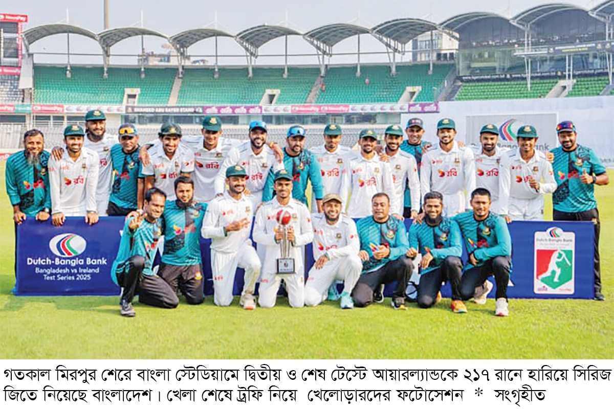 গতকাল রোববার মিরপুর টেস্টের শেষ দিনে আইরিশদের রেকর্ড গড়া ব্যাটিং পারফরম্যান্সের পর বাংলাদেশ জিতেছে ২১৭ রানে। মুশফিকুর রহিমের শততম টেস্টকে জয়ে রাঙিয়েছে বাংলাদেশ। তাতে দুই টেস্টের সিরিজে আইরিশদের হোয়াইটওয়াশ করেছে স্বাগতিকরা। তবে স্রেফ চার উইকেট নিয়ে শেষ দিন শুরু করেও পঞ্চম দিনে চমকপ্রদ ব্যাটিং পারফরম্যান্সে ৫৯.৩ ওভার ব্যাটিং করেন আইরিশরা। শেষ পর্যন্ত ১১৩.৩ ওভারে ২৯১ রানে থামে তাদের ইনিংস। মিরপুর চতুর্থ ইনিংসে সফরকারী দলের সর্বোচ্চ ইনিংস আগে ছিল ২০১৭ সালে অস্ট্রেলিয়ার ২৪৪। সবচেয়ে বেশি ওভার ছিল ২০১৮ সালে জিম্বাবুয়ের ৮৩.১ ওভার। সাকিব আল হাসানকে টপকে আগের দিনই বাংলাদেশের সর্বোচ্চ উইকেটের রেকর্ড গড়েছিলেন তাইজুল ইসলাম। শেষ দিনে তিনি দেশের প্রথম বোলার হিসেবে স্পর্শ করেন ২৫০ উইকেট। ৫৭ টেস্টে এই মাইলফলকে পা রেখে বাঁহাতি স্পিনারদের মধ্যে দ্রুততম হিসেবে তিনি ছুঁয়ে ফেলেন রাঙ্গানা হেরাথের বিশ্ব রেকর্ড। দুই ইনিংসেই তার প্রাপ্তি চারটি উইকেট। দুই টেস্টে ১৩ উইকেট নিয়ে তিনি সিরিজের সেরা।