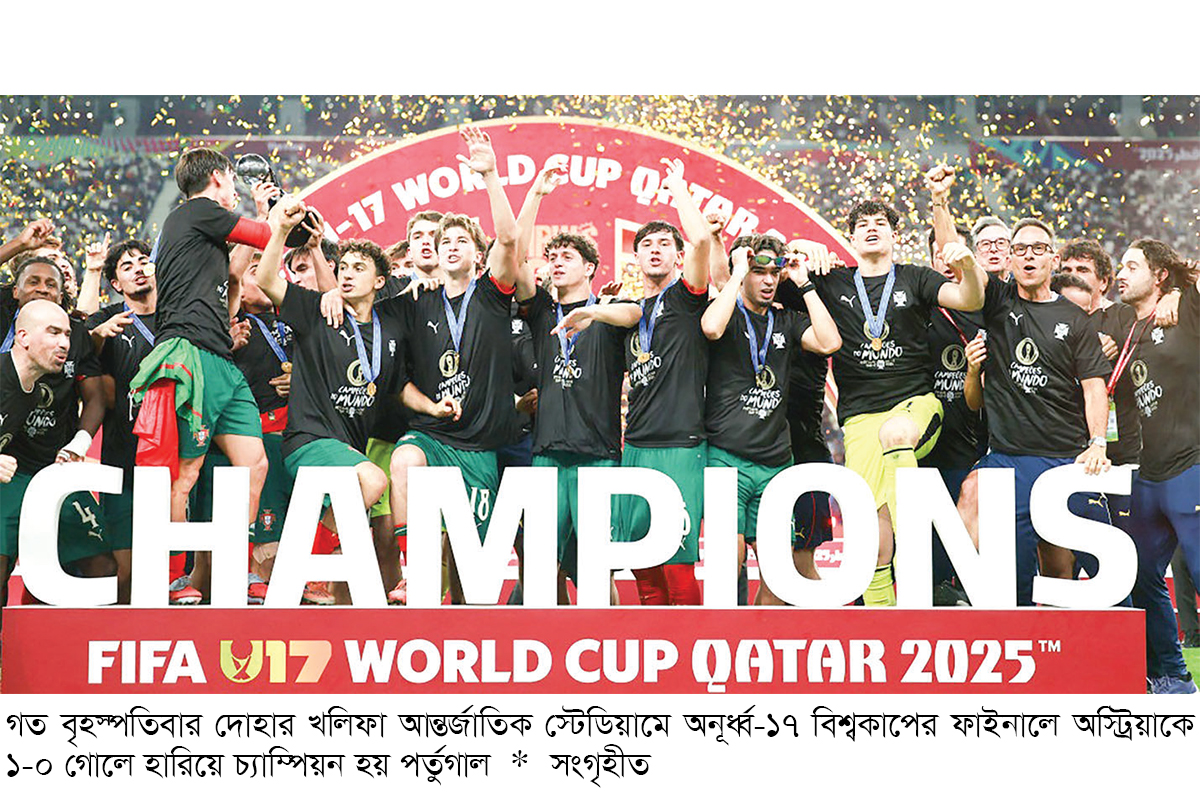 ২০২২ সালে কাতার বিশ্বকাপের কোয়ার্টার ফাইনাল থেকে ছিটকে গিয়েছিল পর্তুগাল জাতীয় ফুটবল দল। তারকায় ঠাসা স্কোয়াড হওয়া সত্ত্বেও তাদের সেরা তারকা ক্রিস্টিয়ানো রোনালদোকে মাঠ ছাড়তে হয়েছিল কান্নাভেজা চোখে। সেই কাতারের মাটিতেই এবার অনন্য সাফল্য পেয়ে পর্তুগাল অনূর্ধ্ব-১৭ দল ভাসল বাঁধভাঙা আনন্দের জোয়ারে। গত বৃহস্পতিবার রাতে দোহার খলিফা আন্তর্জাতিক স্টেডিয়ামে অনুষ্ঠিত জমজমাট ফাইনালে অস্ট্রিয়াকে ১-০ গোলে হারিয়েছে পর্তুগাল। এতে প্রথমবারের মতো ফিফা অনূর্ধ্ব-১৭ বিশ্বকাপে চ্যাম্পিয়ন হওয়ার অভূতপূর্ব স্বাদ পেয়েছে তারা। ম্যাচের ৩২তম মিনিটে বেনফিকার ফরোয়ার্ড আনিসিও কাবরালের লক্ষ্যভেদই ব্যবধান গড়ে দেয়। ১৯৮৯ ও ১৯৯১ সালে টানা দুবার ফিফা অনূর্ধ্ব-২০ বিশ্বকাপের শিরোপা উঁচিয়ে ধরেছিল পর্তুগাল।