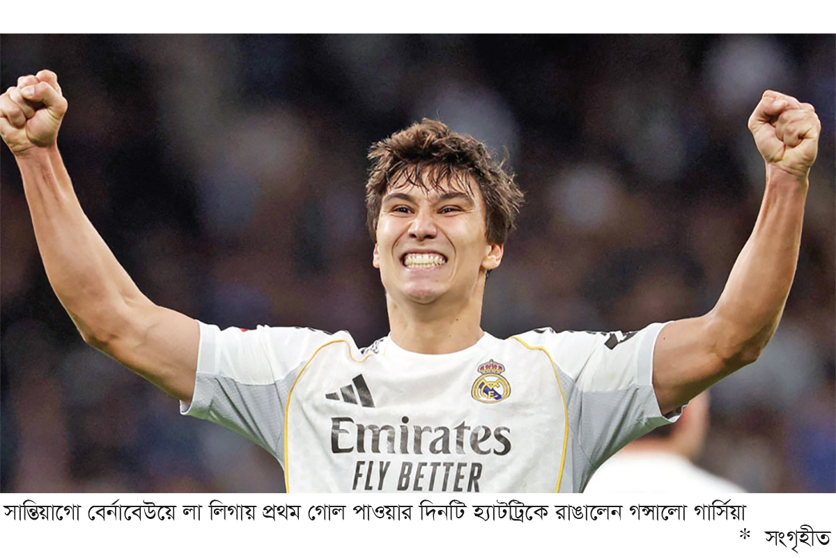 সান্তিয়াগো বের্নাবেউয়ে খেলতে নেমে গোল করছেন, গোটা গ্যালারি গর্জন করছে। অপার্থিব এক অনুভূতি। রিয়াল মাদ্রিদের একাডেমিতে বেড়ে ওঠার দিনগুলি থেকেই এমন ছবি নিশ্চয়ই হৃদয়ে অনেকবারই এঁকেছেন গন্সালো গার্সিয়া। উদযাপনের দৃশ্য ফুটিয়ে তুলেছেন কল্পনার চোখে। সেই স্বপ্নগুলোই সত্যি হলো এবার। শুধু একটি গোল নয়, লা লিগায় প্রথম গোল পাওয়ার দিনটি তিনি রাঙালেন স্মরণীয় এক হ্যাটট্রিকে। লা লিগায় রিয়াল বেতিসের বিপক্ষে গত রোববার রিয়াল মাদ্রিদের ৫-১ গোলের জয়ে চোখধাঁধানো এক হ্যাটট্রিক উপহার দেন গার্সিয়া। তার প্রথম গোলটি ছিল বুক দিয়ে বল নামিয়ে দারুণ এক ভলিতে। পরেরটি করেন দৃষ্টিনন্দন ব্যাক ফ্লিকে। শেষটি হেড থেকে। সব মিলিয়ে বলা যায় পরিপূর্ণ এক হ্যাটট্রিক।