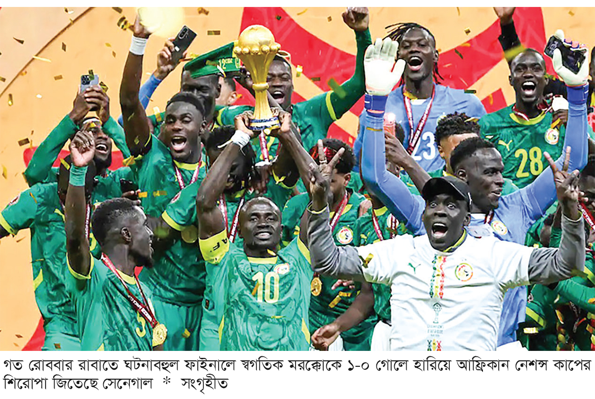অবিশ্বাস্য, অভাবনীয়, হতবাক করা সব ঘটনার দেখা মিলল আফ্রিকান নেশন্স কাপের ফাইনালে। রেফারির সিদ্ধান্তে ক্ষেপে গেল সেনেগালের ফুটবলাররা, সবচেয়ে বেশি যেন মেজাজ হারালেন তাদের কোচ। খেলোয়াড়দের তিনি ডেকে নিলেন ড্রেসিং রুমে। পরে অবশ্য মাঠে ফিরলেন তারা এবং ক্যারিয়ারে হয়তো সবচেয়ে বাজে স্পট কিক নিলেন ব্রাহিম দিয়াস। এরপর অবশ্য লড়াই হলো দারুণ। অনেক বিতর্কের পর, দুর্দান্ত এক গোলে মরক্কোকে কাঁদিয়ে শিরোপা জিতল সেনেগাল। গত রোববার মরক্কোর রাজধানী রাবাতে ঘটনাবহুল ফাইনালে সেনেগালের জয় ১-০ গোলে। নির্ধারিত ৯০ মিনিটে গোলশূন্য সমতার পর, অতিরিক্ত সময়ের শুরুতে দর্শনীয় গোলটি করেন পাপ গেয়ি। দ্বিতীয়বার এই প্রতিযোগিতার শিরোপা জিতল সেনেগাল। প্রথমবার জিতেছিল তারা ২০২১ সালে। মধ্যে এক আসর পরই তারা ফিরে পেল আফ্রিকার মুকুট।