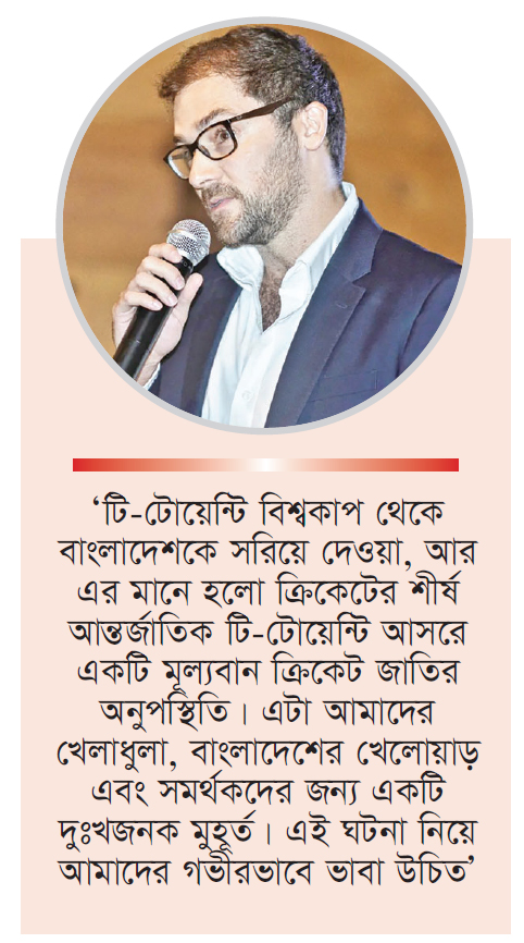 আসন্ন টি-টোয়েন্টি বিশ্বকাপ থেকে বাংলাদেশকে বাদ দেওয়া ঠিক হয়নি বলে জানিয়েছে ওয়ার্ল্ড ক্রিকেটার্স অ্যাসোসিয়েশনের (ডব্লিউসিএ) প্রধান নির্বাহী টম মোফাট। ক্রিকেট পাগল জাতি হিসেবে পরিচিত বাংলাদেশকে ছাড়া বিশ্বকাপের কথা ভাবতে নারা তিনি। ডব্লিউসিএ প্রধান নির্বাহীর মতে, ক্রিকেটে বিভক্তি না তৈরি করে সবাইকে ঐক্যবদ্ধ রাখা উচিত আইসিসির। বাংলাদেশকে বৈশ্বিক আসর থেকে সরিয়ে দেওয়ার সিদ্ধান্তের পেছনে বিশ্ব ক্রিকেটের নিয়ন্তা সংস্থার ভেতরে সমস্যা দেখছেন তিনি। নিরাপত্তা শঙ্কায় ভারত থেকে নিজেদের ম্যাচগুলো শ্রীলঙ্কায় সরিয়ে নিতে দাবি জানায় বাংলাদেশ। কিন্তু তাতে সাড়া দেয়নি আইসিসি। ভারতে না যাওয়ার সিদ্ধান্তে অনড় থাকায় বাংলাদেশকে বিশ্বকাপ থেকে বাদ দিয়ে স্কটল্যান্ডকে সুযোগ দেয় তারা। একই কারণে গত চ্যাম্পিয়ন্স ট্রফিতে পাকিস্তানে খেলতে যায়নি ভারত। শুধু তাই নয়, দুবাইয়ে একই হোটেলে থেকে, একই ভেন্যুতে নিজেদের সবগুলো ম্যাচ খেলেছে তারা। শেষ পর্যন্ত শিরোপাও ঘরে তুলেছে ভারত। বাংলাদেশের ক্ষেত্রে উল্টো দলটিকে বিশ্বকাপ থেকে বাদ দেওয়ায় আইসিসির দ্বিচারিতার কথা বলছেন অনেকে। অভিযোগ উঠছে আইসিসির পক্ষপাতিত্বেরও।