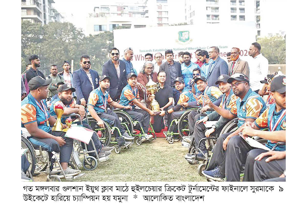 বাংলাদেশ ক্রিকেট বোর্ড (বিসিবি) আয়োজিত হুইলচেয়ার জাতীয় ক্রিকেট দল গঠনের লক্ষ্যে হুইলচেয়ার ক্রিকেট টুর্নামেন্টে চ্যাম্পিয়ন হয়েছে যমুনা। গত মঙ্গলবার গুলশান ইয়ুথ ক্লাব মাঠে অনুষ্ঠিত ফাইনালে তারা ৯ উইকেটে সুরমাকে হারিয়ে শিরোপা জিতে নেয়। প্রথমে ব্যাট করতে নেমে তিন উইকেট হারিয়ে ৮৭ রান করে সুরমা দল। জবাবে মাত্র এক উইকেট হারিয়ে ৮৯ রান করে জয়ের বন্দরে পৌঁছে যায় যমুনা। প্লেয়ার অব দ্য ফাইনাল রায়হান হোসেন রাজা, ম্যান অব দ্য টুর্নামেন্ট ও সেরা বোলার রাজু মিয়া এবং সেরা ব্যাটার জুলহাস। খেলা শেষে বিজয়ীদের হাতে পুরস্কার তুলে দেন বিসিবির পরিচালক ও সংগীতশিল্পী আসিফ আকবর।