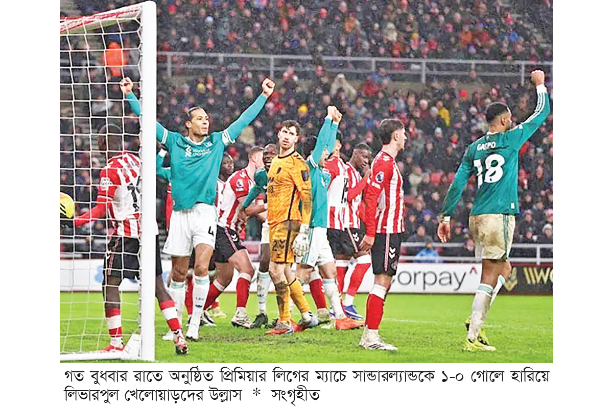 দীর্ঘদিন পর মাঠে এমন এক ম্যাচ খেলল লিভারপুল, যেখানে ধৈর্যই হয়ে উঠল বড় অস্ত্র। প্রতিপক্ষের মাঠে বলের নিয়ন্ত্রণ, সুযোগ সৃষ্টি এবং ক্রমাগত চাপ; সবকিছু মিলিয়েও গোল আসছিল না। অবশেষে বিরতির পর কর্নার থেকে অধিনায়ক ভার্জিল ফন ডাইকের হেডই গড়ে দিল ব্যবধান। ১-০ গোলের জয় এনে দিল স্বস্তি, আর লিভারপুল ফিরল জয়ের ধারায়। গত বুধবার রাতে সান্ডারল্যান্ডের মাঠে অনুষ্ঠিত প্রিমিয়ার লিগের ম্যাচে শুরু থেকেই এগিয়ে ছিল লিভারপুল। আর্নে স্লটের দল বল দখলে ও আক্রমণে স্পষ্ট প্রাধান্য দেখায়। ৩৩তম মিনিটে এগিয়ে যাওয়ার বড় সুযোগ পান ফ্লোরিয়ান ভির্টজ। তার শট পোস্টে লেগে ফিরে আসে। কয়েক মিনিট পর আবারও বক্সের ভেতরে হেড নিলেও গোলরক্ষক রুখে দেন।