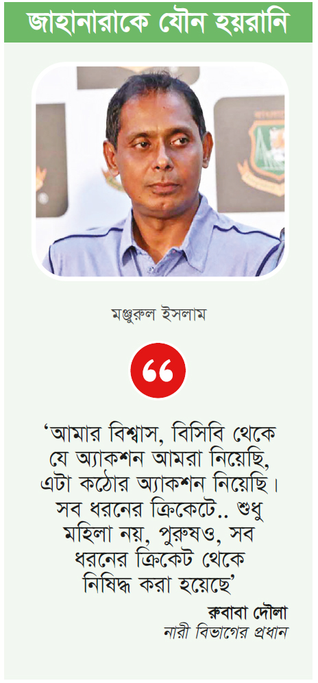 জাহানারা আলমকে যৌন হয়রানির দায়ে মঞ্জুরুল ইসলামের শাস্তি যথেষ্ট কঠোর বলেই মনে করেন বিসিবি নারী বিভাগের প্রধান ও তদন্ত কমিটির সদস্য রুবাবা দৌলা। আপাতত আর কোনো আইনি প্রক্রিয়ায় যাচ্ছে না বিসিবি। গত রোববার বিসিবির পরিচালনা পর্ষদের সভা শেষে জানানো হয়, সবধরনের ক্রিকেটীয় কার্যক্রম থেকে নিষিদ্ধ করা হয়েছে মঞ্জুকে। সংবাদ বিজ্ঞপ্তিতে তখন বলা হয়েছিল, তদন্ত কমিটির সুপারিশ পর্যালোচনা করে প্রয়োজনে আরও ব্যবস্থা নেওয়া হবে।