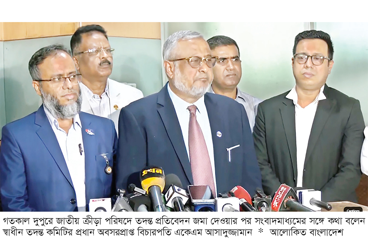 গতকাল রোববার দুপুরে জাতীয় ক্রীড়া পরিষদে এই রিপোর্ট পৌঁছে জমা দেন স্বাধীন তদন্ত কমিটির প্রধান বিচারপতি (অবসরপ্রাপ্ত) একেএম আসাদুজ্জামান। তার সঙ্গে সদস্য হিসেবে ছিলেন যুব ও ক্রীড়া মন্ত্রণালয়ের অতিরিক্ত সচিব সেলিম ফকির, যুগ্ম পুলিশ কমিশনার নাসিরুল ইসলাম, ক্রীড়া সাংবাদিক এটিএম সাইদুজ্জামান ও বাংলাদেশ সুপ্রিম কোর্টের অ্যাডভোকেট ব্যারিস্টার সালেহ আকরাম সম্রাট। পরে সংবাদমাধ্যমের মুখোমুখি হয়ে কথা বলেন একেএম আসাদুজ্জামান।