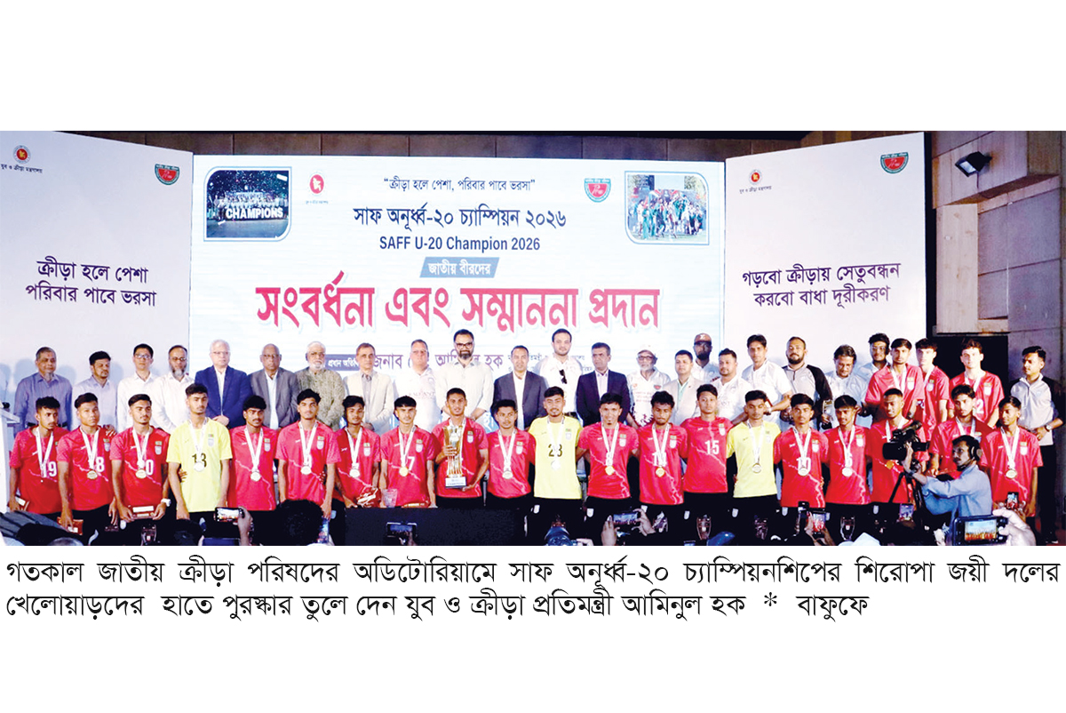 সাফ অনূর্ধ্ব-২০ ফুটবল চ্যাম্পিয়নশিপে টানা দ্বিতীয়বার শিরোপা জয়ের কৃতিত্ব দেখানো বাংলাদেশ দলকে আনুষ্ঠানিকভাবে সম্মাননা ও আর্থিক পুরস্কার দিয়েছে যুব ও ক্রীড়া মন্ত্রণালয়। আন্তর্জাতিক ক্রীড়া দিবস উপলক্ষে জাতীয় ক্রীড়া পরিষদের গতকাল সোমবার অডিটোরিয়ামে আয়োজিত অনুষ্ঠানে বিজয়ী দলের হাতে পুরস্কার তুলে দেন যুব ও ক্রীড়া প্রতিমন্ত্রী আমিনুল হক। মালদ্বীপের মালেতে অনুষ্ঠিত ফাইনালে ভারতকে টাইব্রেকারে ৪-৩ ব্যবধানে হারিয়ে চ্যাম্পিয়ন হয় বাংলাদেশ। এই সাফল্যের পর দেশজুড়ে তৈরি হয় উচ্ছ্বাস, আর সেই অর্জনের স্বীকৃতিতেই সরকারিভাবে সম্মানিত করা হলো দলের খেলোয়াড় ও কর্মকর্তাদের। অনুষ্ঠানে দলের প্রতিটি খেলোয়াড় এবং সংশ্লিষ্ট কর্মকর্তাকে ১ লাখ টাকা করে আর্থিক পুরস্কার দেওয়া হয়। পাশাপাশি দেওয়া হয়েছে ক্রীড়া পরিচয়পত্র ও সম্মাননা ক্রেস্ট। প্রতিমন্ত্রী বলেন, এই অর্জন দেশের ফুটবলের জন্য ইতিবাচক বার্তা বহন করে এবং ভবিষ্যতে খেলোয়াড়দের উন্নয়নে আরও সহায়তা দেওয়া হবে।