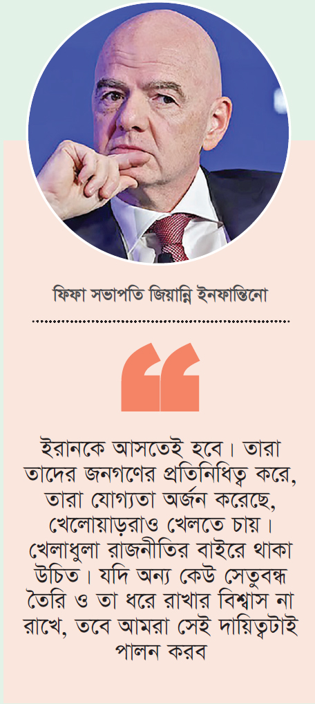 ইরানের বিশ্বকাপ খেলার যৌক্তিকতা তুলে ধরে ইনফান্তিনো আরও বলেন, ‘ইরানকে আসতেই হবে। তারা তাদের জনগণের প্রতিনিধিত্ব করে, তারা যোগ্যতা অর্জন করেছে, খেলোয়াড়েরাও খেলতে চায়। খেলাধুলা রাজনীতির বাইরে থাকা উচিত। যদি অন্য কেউ সেতুবন্ধ তৈরি ও তা ধরে রাখার বিশ্বাস না রাখে, তবে আমরা সেই দায়িত্বটাই পালন করব।’