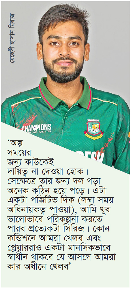 মিরাজ বলেন, ‘২০২৭ সালের বিশ্বকাপ অবশ্যই একটা প্রসেসের ব্যাপার এবং লম্বা সময়ের ব্যাপার। সেই পর্যন্ত যেতে গেলে প্রসেসটা মেইনটেইন করতে হবে এবং সিরিজগুলোতে ভালো খেলতে হবে। শেষ দুইটা সিরিজে আমরা খুবই ভালো ক্রিকেট খেলেছি এবং প্রসেসটা ভালো ছিল এবং প্লেয়াররাও অনেক আত্মবিশ্বাসী। লং টাইমের জন্য একজন অধিনায়ক যদি থাকে একটা টিমকে খুব ভালোভাবে গড়তে পারে।’
