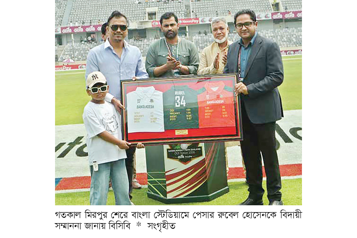 একটা সময় ছিল যখন বাংলাদেশ জাতীয় ক্রিকেট দলের পেস আক্রমণের সামনের সারিতে ছিলেন রুবেল হোসেন। দলকে ব্রেক থ্রু এনে দিতেন নিয়মিত। তবে দীর্ঘদিন ধরেই জাতীয় দলের বাহিরে ‘বাগেরহাট এক্সপ্রেস’ খ্যাত এ পেসার। কিছুদিন আগে অবসরের ঘোষণাও দিয়েছিলেন। এবার আনুষ্ঠানিক বিদায় নিলেন রুবেল। সতীর্থদের কাছ থেকে ভালোবাসা আর ক্রিকেট বোর্ডের আনুষ্ঠানিক সম্মান পেয়ে রুবেল হোসেন ছুটলেন মিরপুরের বাইশগজের দিকে। পুত্রকে পাশে নিয়ে পিচের মাটি স্পর্শ করে নিলেন। অন্তর্জাতিক ক্রিকেট থেকে অবসরের ঘোষণা দেওয়া পেসার রুবেল হোসেন বিশেষ সম্মাননা পেয়ে বললেন, তিনি গর্বিত ও কৃতজ্ঞ। রুবেলের আন্তর্জাতিক ক্যারিয়ার থমকে ছিল বছর পাঁচেক ধরেই। ৩৬ বছর বয়সী পেসার গত বুধবার সামাজিক মাধ্যমে বিদায়ের ঘোষণা দেন আনুষ্ঠানিকভাবে। মিরপুরে গতকাল সোমবার বাংলাদেশ-নিউজিল্যান্ড সিরিজের দ্বিতীয় ওয়ানডে শুরুর আগে ছোট্ট এক আয়োজনে রুবেলকে সম্মান জানায় বাংলাদেশ ক্রিকেট বোর্ড (বিসিবি)।