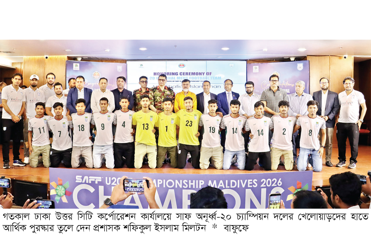মালদ্বীপের মালেতে সাফ অনূর্ধ্ব-২০ চ্যাম্পিয়নশিপের শ্বাসরুদ্ধকর ফাইনালে ভারতকে হারিয়ে শিরোপা জিতেছিল বাংলাদেশ। দেশে ফেরার পর রাজধানীর হাতিরঝিলে বাফুফের কাছ থেকে সংর্বধনাও পেয়েছেন যুবারা। সেই অনুষ্ঠানে ঢাকা উত্তর সিটি কর্পোরেশন (ডিএনসিসি) প্রশাসক শফিকুল ইসলাম মিলটন জয়ীদের জন্য আর্থিক পুরস্কারের ঘোষণা দিয়েছিলেন। গতকাল বুধবার প্রতিশ্রুতি অনুযায়ী সিটি কর্পোরেশন কার্যালয়ে ফুটবলারদের হাতে সেই অর্থপুরস্কার তুলে দেওয়া হয়েছে। নাগরিক সেবার পাশাপাশি দেশের ফুটবলের তৃণমূল উন্নয়নেও যে সিটি কর্পোরেশন বদ্ধপরিকর, এই আয়োজনের মধ্য দিয়ে সেটি আবারও প্রমাণিত হলো।