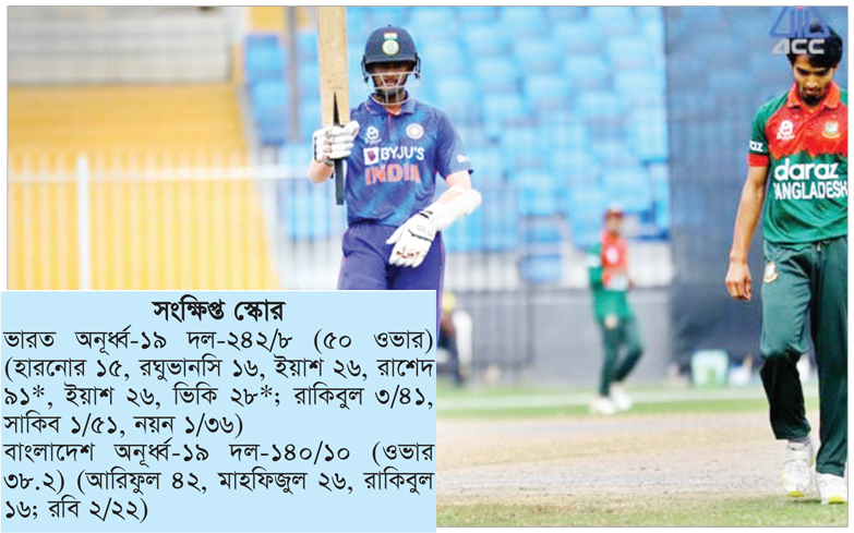 বোলিংয়ে অনেকটা সময় পর্যন্ত প্রতিপক্ষের ওপর ছড়ি ঘুরিয়ে শেষ দিকে ধরে রাখা গেল না ছন্দ। ব্যাটিং হলো ভীষণ বাজে। একজন ছাড়া বাকিরা কেউ সেভাবে দাঁড়াতেই পারল না। ভারতের কাছে বড় হারে যুব এশিয়া কাপের সেমিফাইনাল থেকে বিদায় নিল বাংলাদেশ। শারজাহ ক্রিকেট স্টেডিয়ামে গতকাল বৃহস্পতিবার দ্বিতীয় সেমিফাইনালে ১০৩ রানে হারে বাংলাদেশের যুবারা। ২৪৪ রানের লক্ষ্য তাড়ায় গুটিয়ে যায় তারা ১৪০ রানে। এতেই ফাইনালের টিকিট পায় ভারত। ২০১৯ সালে সবশেষ আসরের ফাইনালে ভারতের বিপক্ষেই ৫ রানে হেরে শিরোপা স্বপ্ন ভেঙেছিল বাংলাদেশের।