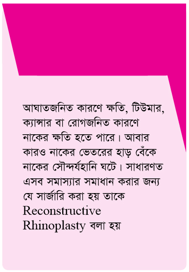 নাক কারও সৌন্দর্য বৃদ্ধি করে, আবার কারও শ্রীহীন করে। সাধারণত জন্মগতত্রুটি বা জন্মগত ঠোঁটকাটা রোগী, আঘাতজনিত কারণে ক্ষতি, টিউমার, ক্যান্সার বা রোগজনিত কারণে নাকের ক্ষতি হতে পারে। আবার কারও নাকের ভেতরের হাড় বেঁকে নাকের সৌন্দর্যহানি ঘটে। সাধারণত এসব সমাস্যার সমাধান করার জন্য যে সার্জারি করা হয় তাকে জবপড়হংঃৎঁপঃরাব জযরহড়ঢ়ষধংঃু বলা হয়।