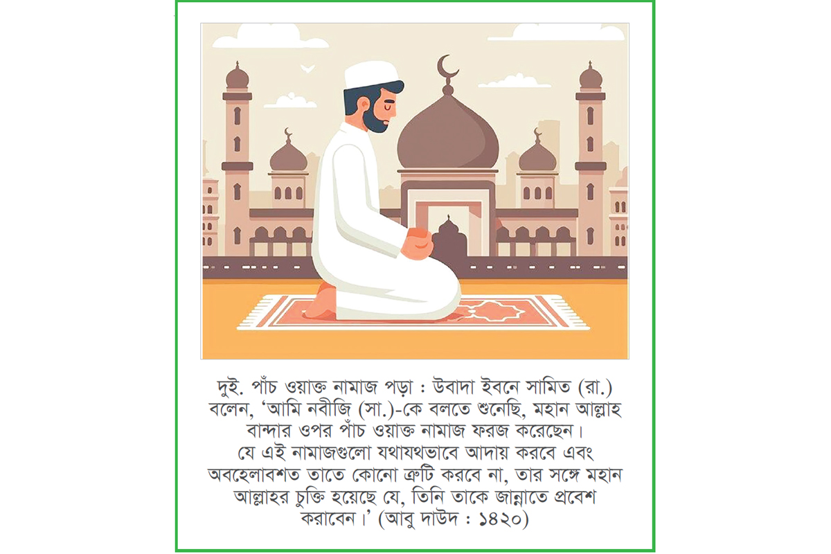 দুই. পাঁচ ওয়াক্ত নামাজ পড়া : উবাদা ইবনে সামিত (রা.) বলেন, ‘আমি নবীজি (সা.)-কে বলতে শুনেছি, মহান আল্লাহ বান্দার ওপর পাঁচ ওয়াক্ত নামাজ ফরজ করেছেন। যে এই নামাজগুলো যথাযথভাবে আদায় করবে এবং অবহেলাবশত তাতে কোনো ত্রুটি করবে না, তার সঙ্গে মহান আল্লাহর চুক্তি হয়েছে যে, তিনি তাকে জান্নাতে প্রবেশ করাবেন।’ (আবু দাউদ : ১৪২০)।