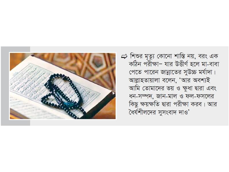 যখন কেউ তার প্রিয়জনকে হারান, তখন সে শোক এমন এক বেদনায় পরিণত হয়, যা শব্দে প্রকাশ করা যায় না। প্রিয়জনের মৃত্যুর খবর পাওয়ার সেই প্রথম মুহূর্তটি এটাই জীবনের সবচেয়ে কঠিন মুহূর্তগুলোর একটি। ওই মুহূর্তে হৃদয় যেন থেমে যায়, সময় স্তব্ধ হয়ে দাঁড়ায় এবং মন বোঝার চেষ্টা করে আপন মানুষটি আর কখনও ফিরে আসবে না। শিশুর মৃত্যু কোনো শাস্তি নয়, বরং এক কঠিন পরীক্ষা- যার উত্তীর্ণ হলে মা-বাবা পেতে পারেন জান্নাতের সুউচ্চ মর্যাদা। আল্লাহতায়ালা বলেন, ‘আর অবশ্যই আমি তোমাদের ভয় ও ক্ষুধা দ্বারা এবং ধন-সম্পদ, জান-মাল ও ফল-ফসলের কিছু ক্ষয়ক্ষতি দ্বারা পরীক্ষা করব। আর ধৈর্যশীলদের সুসংবাদ দাও।’ (সুরা বাকারা : ১৫৫)।