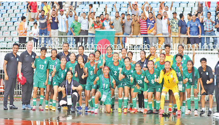 স্বপ্নের সিঁড়ি বেয়ে বাংলাদেশের মেয়েরা এখন এশিয়ান কাপে। ঋতুপর্ণা চাকমার অসাধারণ দুই গোলে স্বাগতিক মিয়ানমারকে হারিয়ে প্রথমবার ২০২৬ সালের এশিয়ান কাপের টিকিট পেয়েছে পিটার বাটলারের দল। তাতে বেড়েছে স্বপ্নের পরিধি। মেয়েদের এশিয়ান কাপের প্রস্তুতি নিয়ে ভাবতে শুরু করেছে বাংলাদেশ ফুটবল ফেডারেশন (বাফুফে)। শক্তিশালী দলগুলোর বিপক্ষে খেলে নিজেদের উন্নতির প্রয়োজনীয়তার কথা প্রায়ই তুলে ধরেন বাংলাদেশ নারী দলের কোচ পিটার জেমস বাটলার। বাছাইয়ের আগে ইন্দোনেশিয়া ও জর্ডানের বিপক্ষে ড্রয়ের ফলও তিনি পেয়েছেন মিয়ানমারে গিয়ে। প্রথমবারের মতো এশিয়ান কাপের মূল পর্বে খেলার যোগ্যতা অর্জন করেছে বাংলাদেশ।]