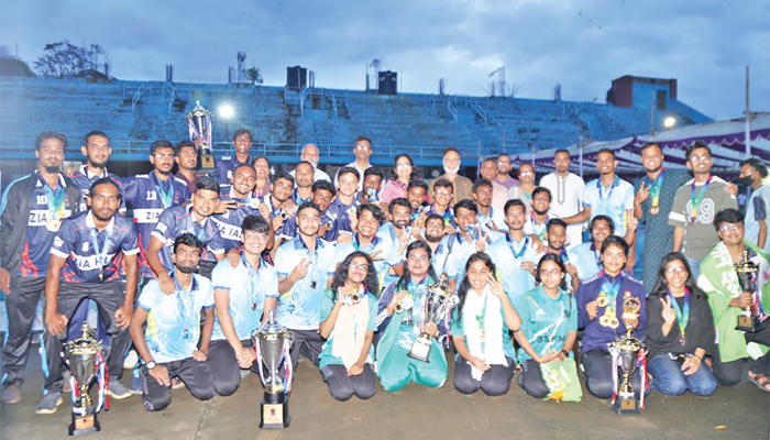 ঢাকা বিশ্ববিদ্যালয় (ঢাবি) আন্তঃহল সাঁতার প্রতিযোগিতায় ছাত্রদের গ্রুপে মুক্তিযোদ্ধা জিয়াউর রহমান হল চ্যাম্পিয়ন হয়েছে। রানার্স-আপ হয়েছে কবি জসীম উদ্দীন হল। একই প্রতিযোগিতায় ছাত্রীদের গ্রুপে শেখ ফজিলাতুন্নেছা মুজিব হল চ্যাম্পিয়ন এবং শামসুন নাহার হল রানার্স-আপ হয়েছে। এছাড়া আন্তঃহল ওয়াটার পোলো প্রতিযোগিতায় ছাত্রদের গ্রুপে মুক্তিযোদ্ধা জিয়াউর রহমান হল চ্যাম্পিয়ন এবং শহিদ সার্জেন্ট জহুরুল হক হল রানার্স-আপ হয়েছে। গত শুক্রবার বিশ্ববিদ্যালয়ের সুইমিংপুলে ঢাকা বিশ্ববিদ্যালয়ের প্রো-ভাইস চ্যান্সেলর (প্রশাসন) অধ্যাপক ড. সায়মা হক বিদিশা বিশ্ববিদ্যালয়ের প্রধান অতিথি হিসেবে উপস্থিত থেকে বিজয়ীদের মাঝে পুরস্কার বিতরণ করেন। সাঁতার ও ওয়াটার পোলো কমিটির সভাপতি অধ্যাপক কাজী মোহাম্মদ মাহবুবুর রহমানের সভাপতিত্বে পুরস্কার বিতরণী অনুষ্ঠানে শারীরিক শিক্ষা কেন্দ্রের উপদেষ্টা অধ্যাপক ড. এএসএম মোস্তফা আল মামুন, কেন্দ্রের ভারপ্রাপ্ত পরিচালক এসএম জাকারিয়াসহ বিভিন্ন হলের প্রাধ্যক্ষ, আবাসিক শিক্ষক, শিক্ষার্থী ও খেলোয়াড়রা উপস্থিত ছিলেন। দুই দিনব্যাপী এই প্রতিযোগিতায় ছাত্রদের গ্রুপে যৌথভাবে শ্রেষ্ঠ সাঁতারু হয়েছেন মুক্তিযোদ্ধা জিয়াউর রহমান হলের শেখ জামিল হাসান ও কবি জসীম উদ্দীন হলের রাকিবুল ইসলাম তুষার। ছাত্রীদের গ্রুপে শ্রেষ্ঠ সাঁতারু হয়েছেন শামসুন নাহার হলের জুয়াইরিয়া ফেরদৌস।