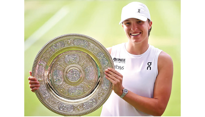 উইম্বলডনের মেয়েদের এককে প্রথমবারের মতো শিরোপা জিতে ইতিহাস গড়েছেন পোলিশ টেনিস তারকা ইগা সিওনতেক। গত শনিবার রাতে ফাইনালে মাত্র ৫৭ মিনিটে মার্কিন প্রতিপক্ষ অ্যামান্ডা আনিসিমোভাকে ৬-০, ৬-০ গেমে উড়িয়ে দিয়ে গ্র্যান্ড স্ল্যামের সবচেয়ে মর্যাদাপূর্ণ আসরে নতুন রানি বনে যান ২৪ বছর বয়সি এ টেনিস সেনসেশন। ‘ডাবল বাগেল’-একটি ফাইনালে প্রতিপক্ষকে একটিও গেম না জিততে দেওয়া-এমন দাপুটে জয় শেষবার উইম্বলডনে দেখা গিয়েছিল ১৯১১ সালে। ১১৪ বছর পর সে বিরল দৃশ্যের পুনরাবৃত্তি ঘটালেন সিওনতেক। চারটি ফ্রেঞ্চ ওপেন ও একটি ইউএস ওপেনের সঙ্গে ষষ্ঠ গ্র্যান্ড স্লাম হিসেবে সিওনতেকের নামের পাশে যুক্ত হলো উইম্বলডন। বিজয়ের তরতাজা অনুভূতি সিওনতেক প্রকাশ করলেন এভাবে, ‘সবকিছু একেবারে অবাস্তব লাগছে। প্রথমে আমি আমান্ডাকে অভিনন্দন জানাতে চাই দারুণ দুটি সপ্তাহের জন্য। তুমি যা করেছো, তার জন্য গর্ব করা উচিত। আশা করি এখানে আরও ফাইনাল খেলবো আমরা।’